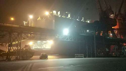 Late at night, vehicles arrive at Qingdao port.