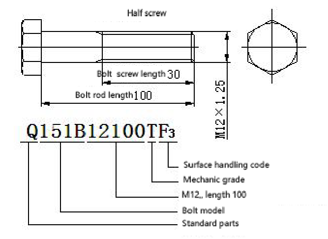 The bolt of the type "Q151B" is a common hexagonal bolt. The thread structure is a semi-threaded fine tooth with a tooth pitch of 1.25 mm.