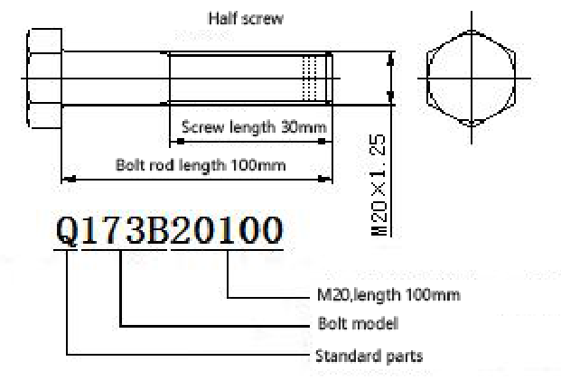 the bolt of the type "Q173B" is a bolt with a hole in the ordinary hexagon head. The thread structure is a semi-threaded fine tooth with a tooth pitch of 1.25 mm. Other parameters are attached.