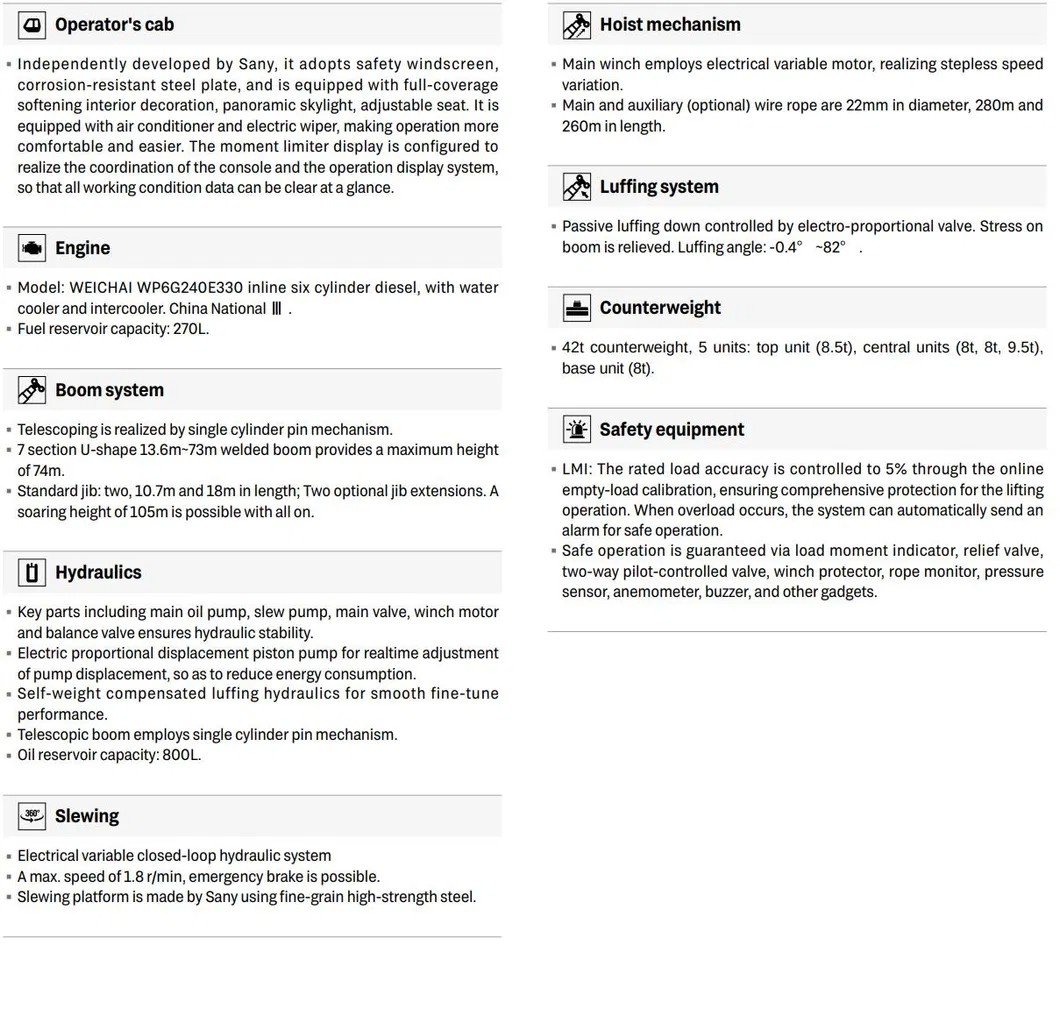 Model STC600S STC700T STC800S STC900T STC1000S STC1300S Operation Full Counterweight 7.6T 10.5T 13T 16.1T 23.5T 42T Max Lifting Capacity 60T 70T 80T 90T 90T 130T Max Boom Length 43.5m 46m 47m 50m 56m 65.6m Max Jib Length 16m 16m 17.5m 27m 21.5m 35.5m Max Lifting Height 60m 62.5m 64.7m 77.5m 77.5m 100m Max Lifting Moment 2009kN·m 2107kN·m 2958kN·m 3293kN·m 3300kN·m 4920kN·m Traveling Available Districts LHD & RHD countries LHD countries LHD & RHD countries LHD countries Outside Europe & USA Uzbekistan & Philippines Engine Model