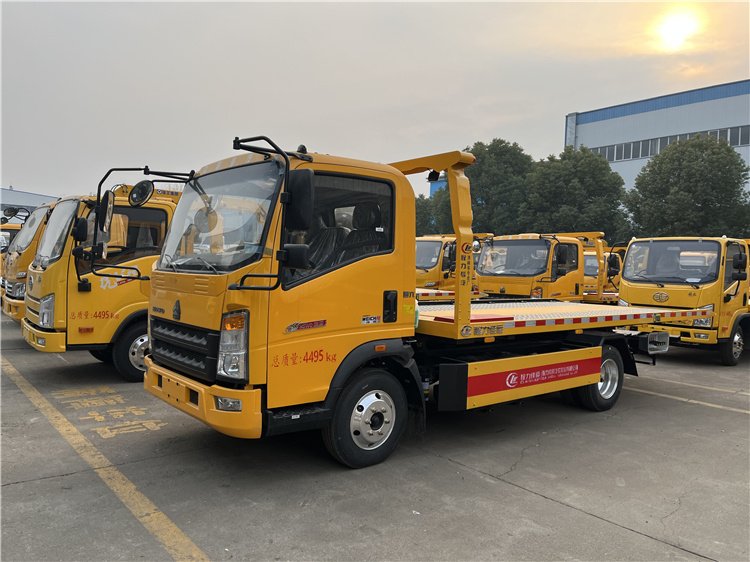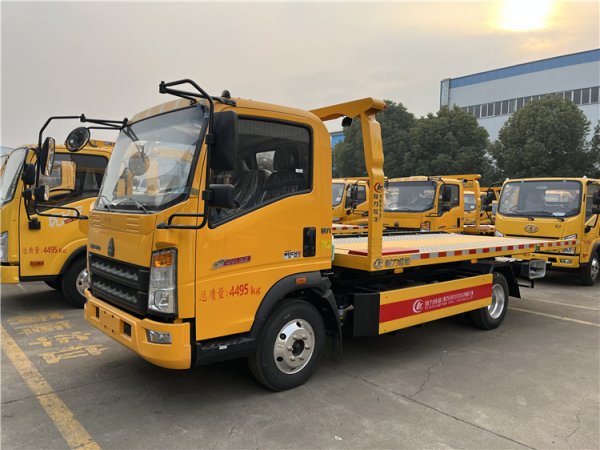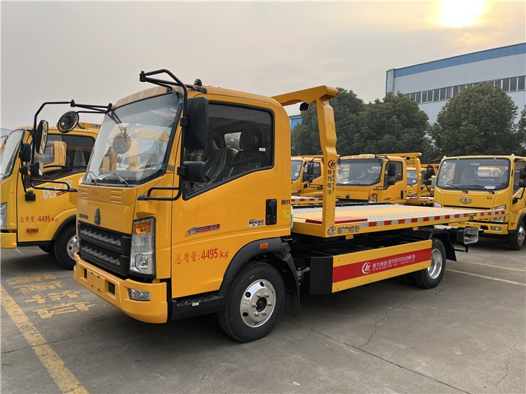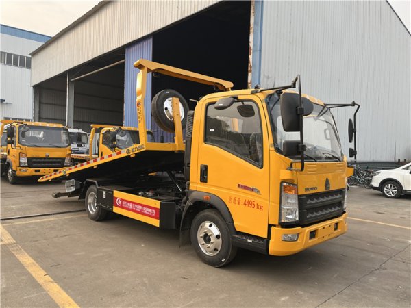 SINOTRUK HOWO 4×2 90 km/h Euro-II 110 HP 6-speed manual 2 t/3 t axles 4 t payload 5100×2300 mm slide flatbed 3-ton one-tow-two road wrecker tow truck—factory-built with sliding platform and 4 t winch, ready for global rescue fleets.